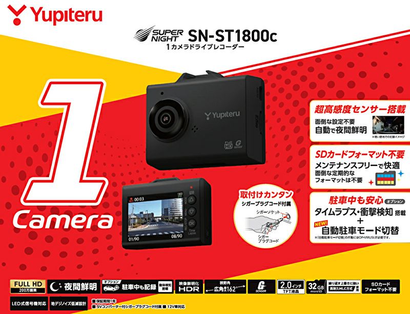 液晶画面 2.0インチ ・ Gセンサー搭載 画質200万画素 ・ 最大記録画角 対角162° 動体検知機能搭載 ・ 32GBmicroSDカード付属 シガープラグコード付属